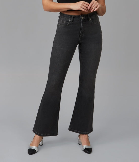 Rock the retro trend with Alice GMS High Rise Flare Jeans. At 32" inseam, these jeans elongate the legs while the soft and stretchy fabric provides ultimate comfort. Dark grey adds a touch of edginess to your style. It's a win-win-win situation.