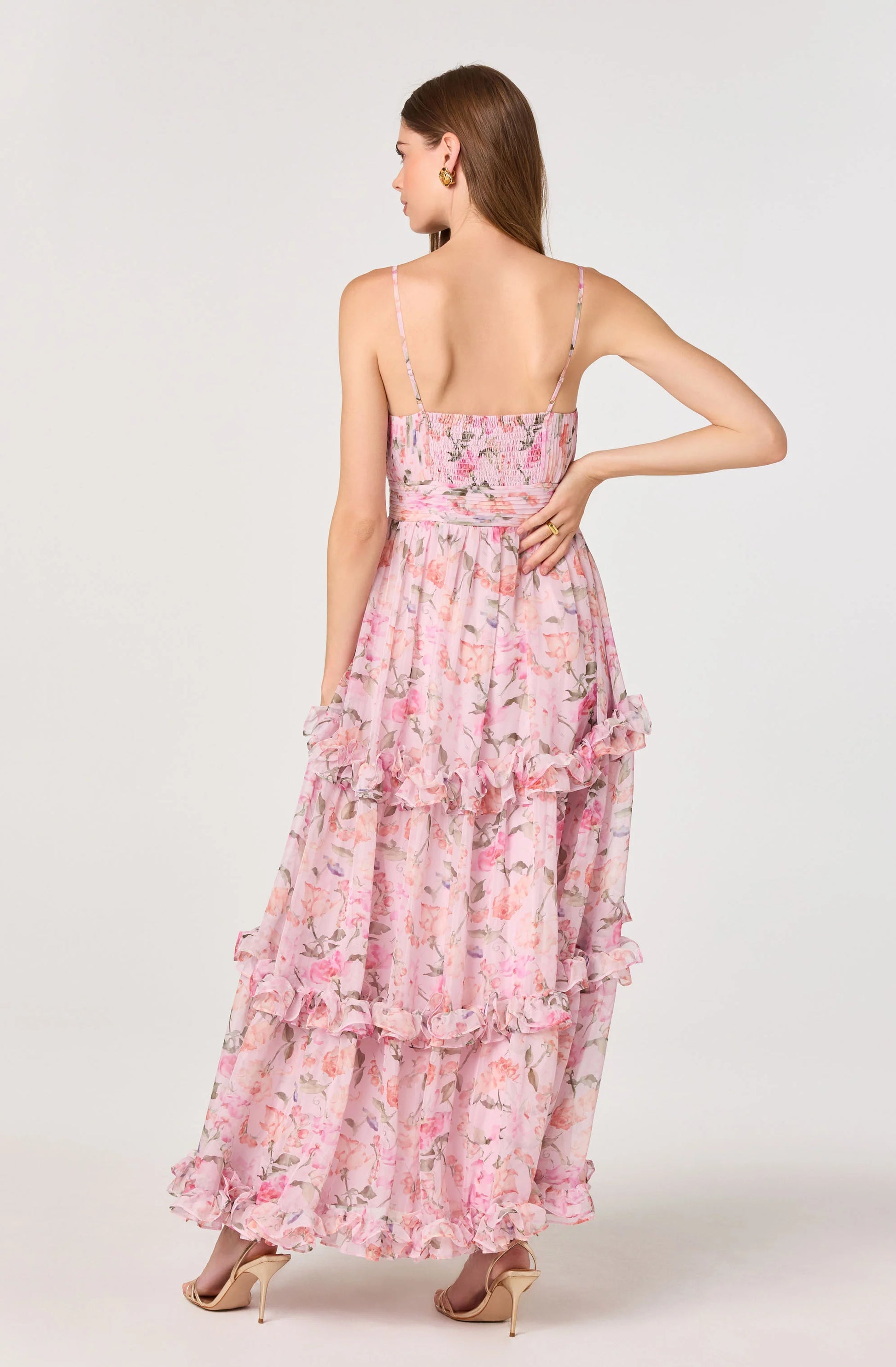 Discover timeless romance in the Ayanna Dress, a chiffon maxi that captures effortless grace with its pleated bodice and cascading tiered ruffles. Adorned with delicate pink florals, this flowing silhouette moves beautifully with every step, making it perfect for garden parties, weddings, or any occasion calling for understated sophistication. The airy chiffon fabric ensures comfort while the diagonal pleating adds dimension and flattering structure to your frame.