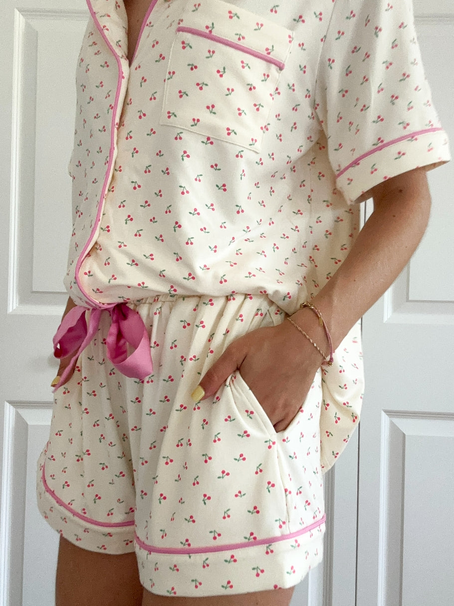 These Cherries All Over PJ Shorts feature a soft fabric adorned with an adorable pink cherry print, delivering comfort with a playful touch. A large silky pink tie at the waist adds elegant charm while allowing for a customizable fit. Practical pockets offer convenience, making these shorts a perfect blend of style and functionality for relaxing at home.