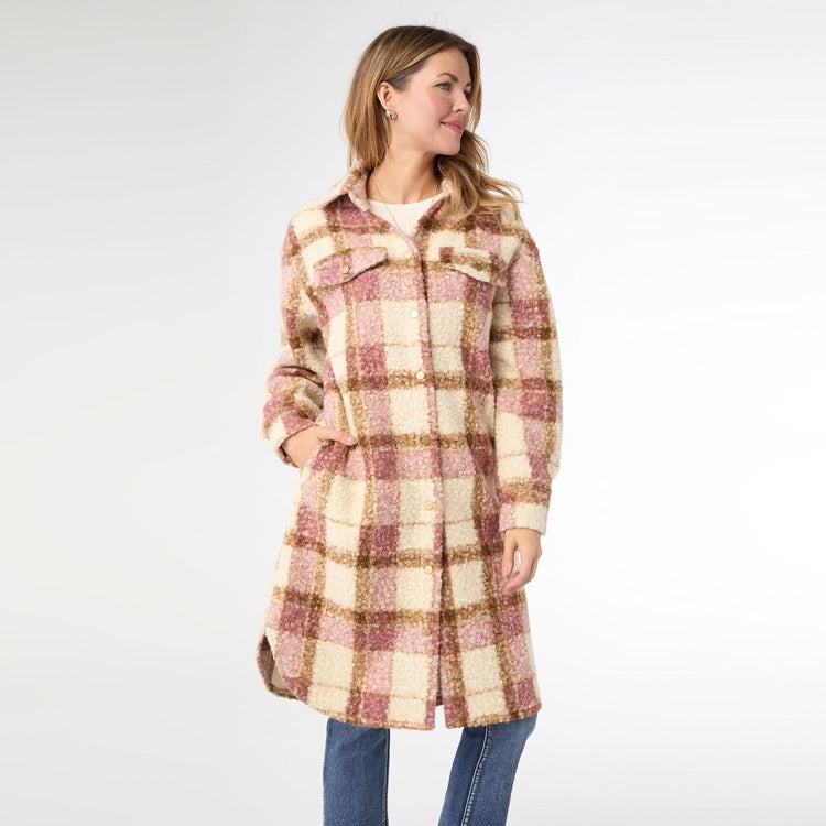 The Ella Colorblock Shacket combines dusty rose and tan plaid in a relaxed fit that hits at the knee, offering both comfort and style. Crafted from a soft fabric, it provides a cozy layering option perfect for transitional weather while maintaining an effortlessly chic silhouette.