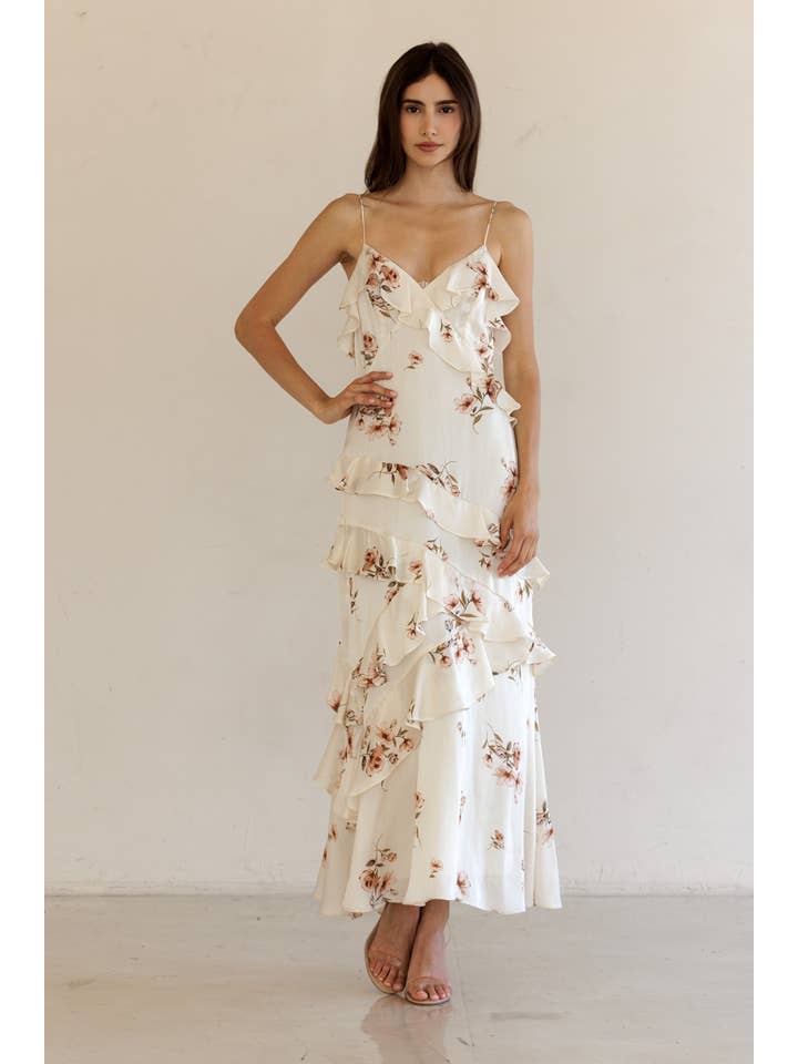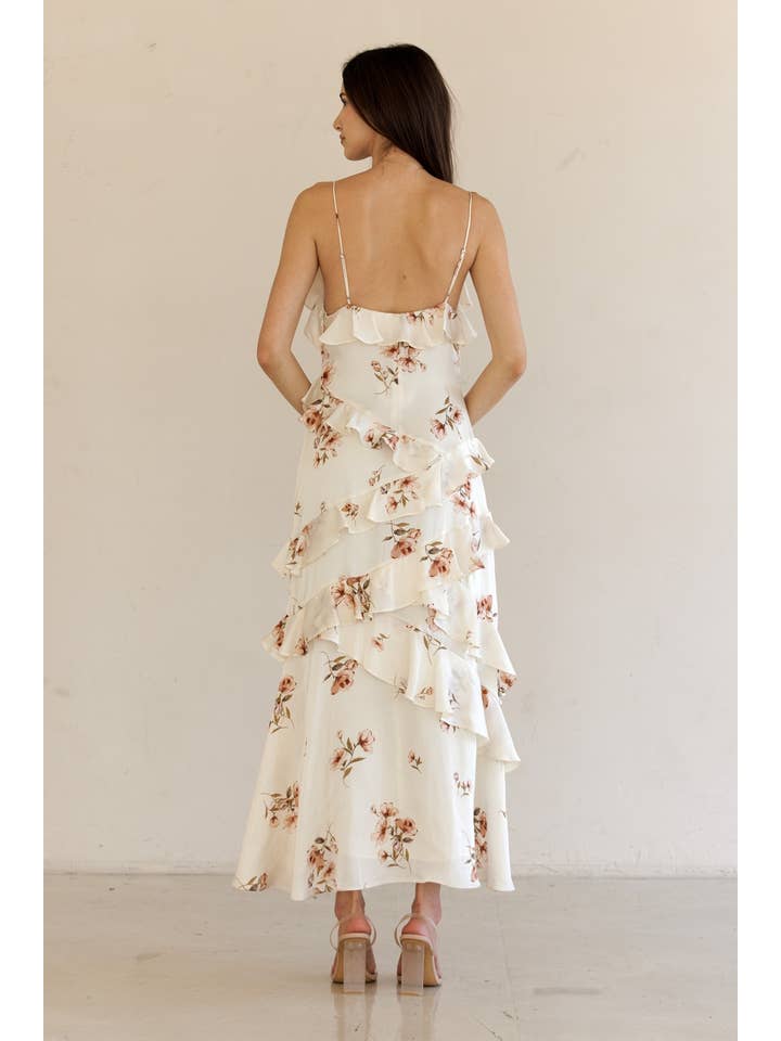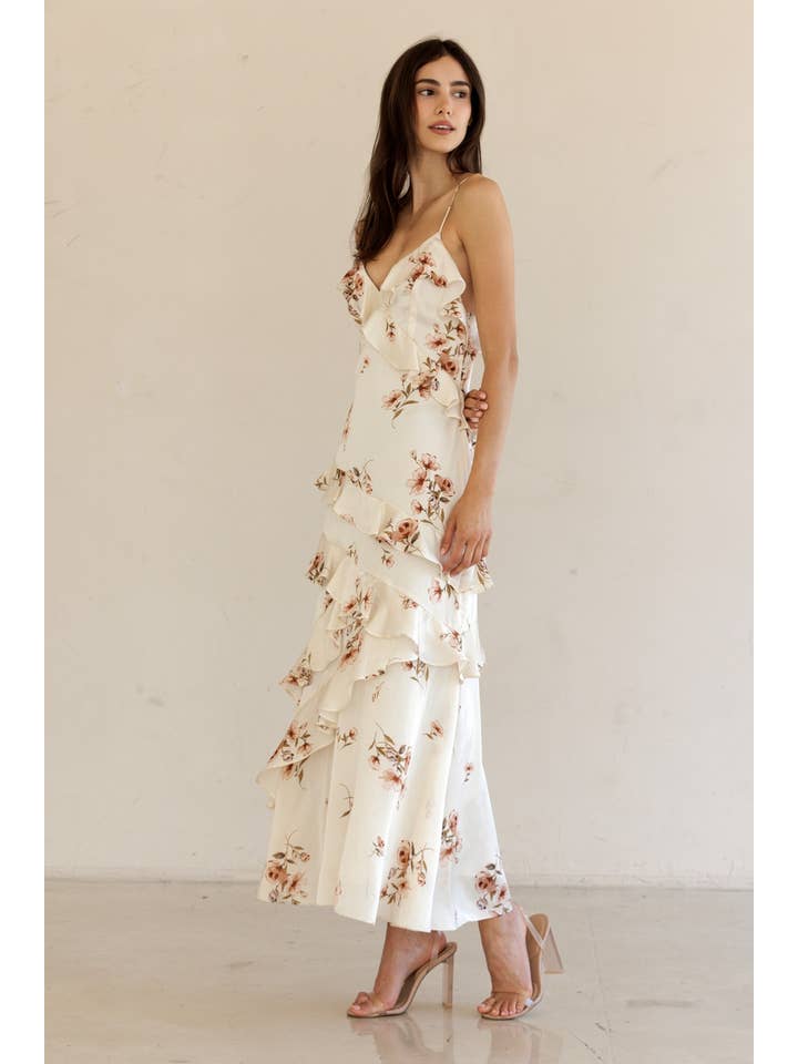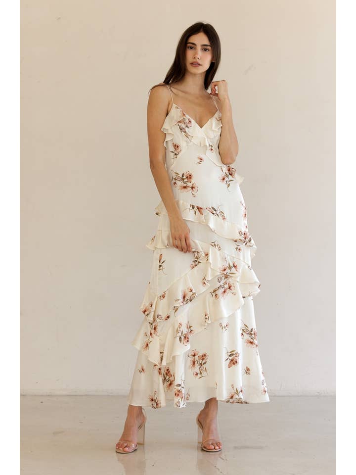 The Floral Ruffle Maxi offers a relaxed, flowy fit enhanced by a V-neckline adorned with delicate ruffle detailing for subtle elegance. Adjustable spaghetti straps allow for a tailored fit, while the ruffled tiered design adds graceful movement and a refined silhouette. Crafted from a lightweight, soft fabric featuring a gentle floral pattern in ivory, pink, and soft green, this maxi dress transitions seamlessly between casual and elegant occasions.