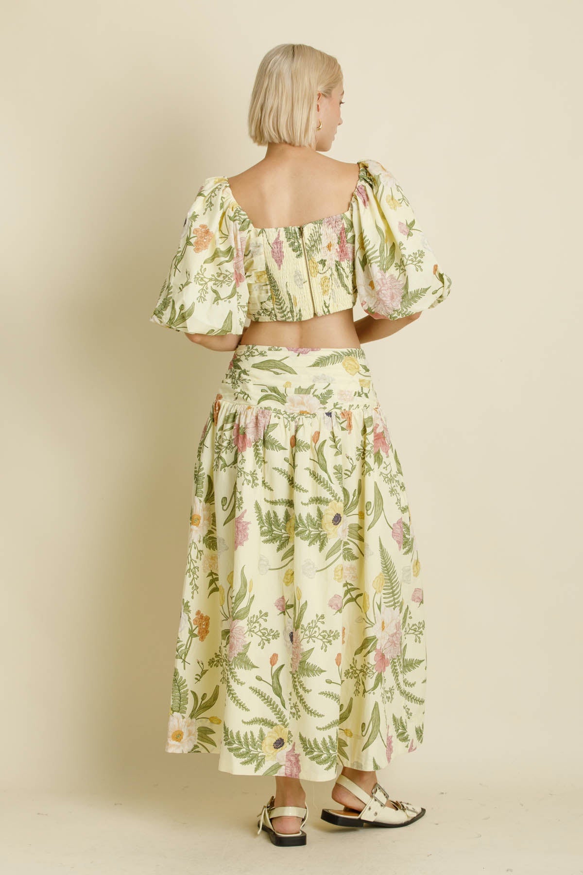 Be a ray of sunshine in our Floral Shirred Midi Skirt! Made with pale yellow cotton poplin, this midi skirt features a beautiful floral botanical print that will make you feel like you're walking through a sunny garden. The shirred waist adds a touch of whimsy and ensures a perfect fit.