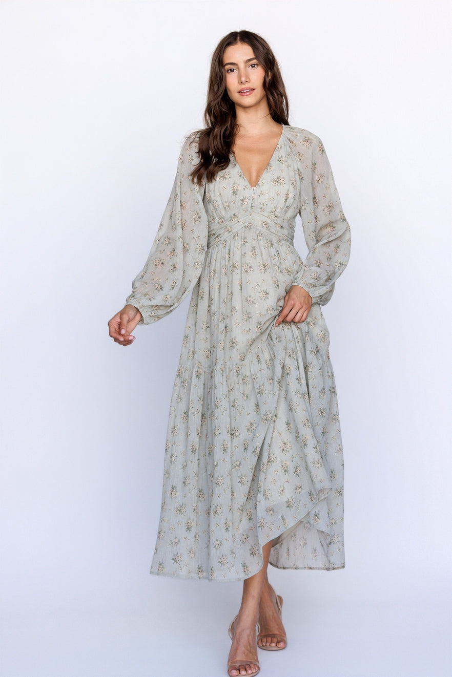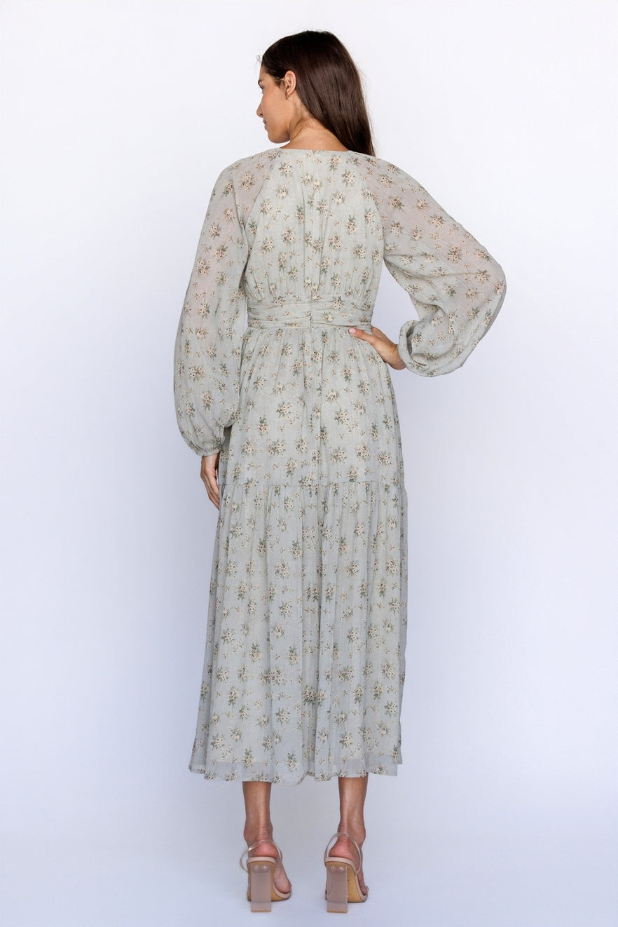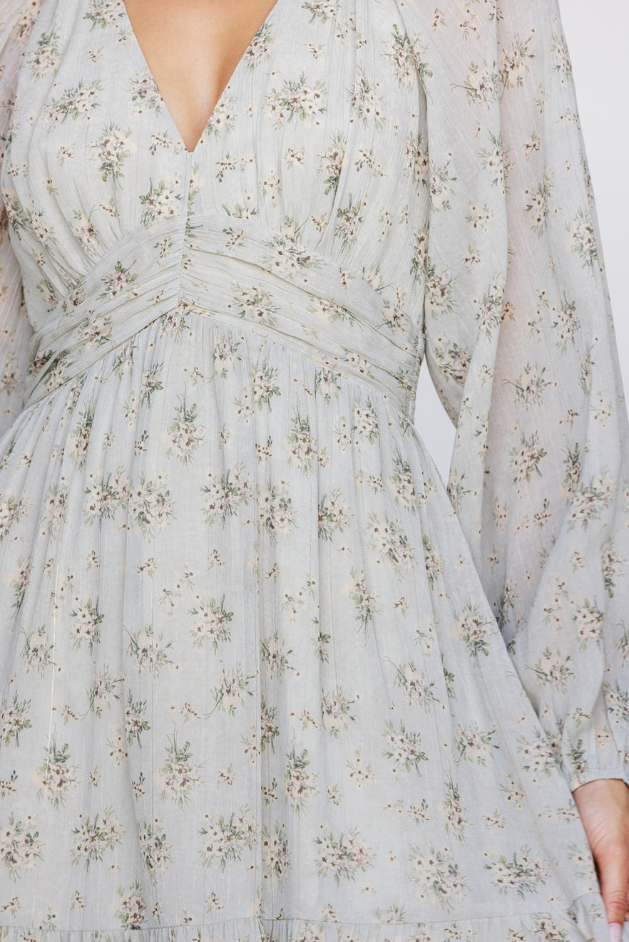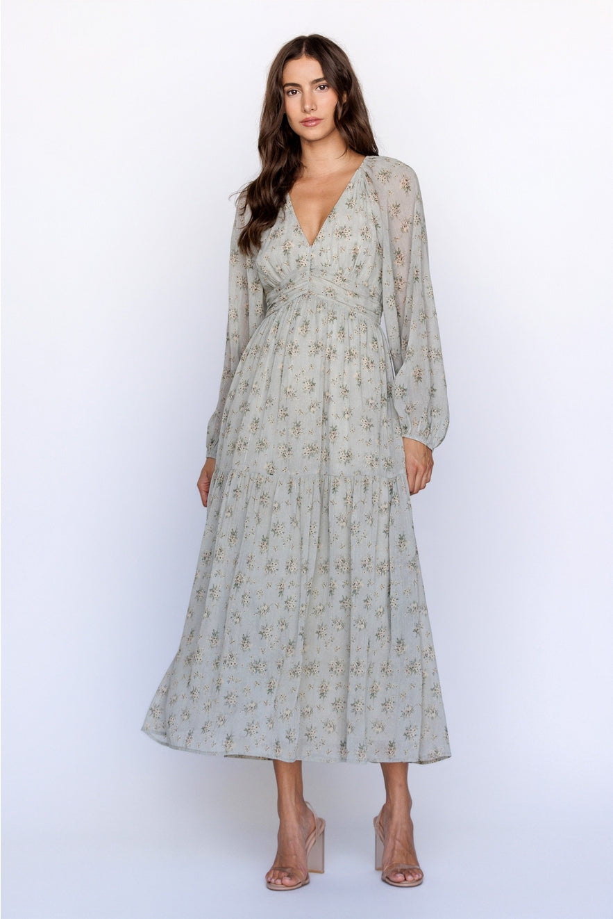 Embrace timeless elegance with this Floral Tiered Midi Dress, featuring a delicate green and cream floral print. The feminine midi silhouette is enhanced by tiered skirt panels that create graceful movement. A V-neckline beautifully frames the gathered bust and wrapped waist, while long sheer sleeves with elastic cuffs add a subtle, soft volume. Completed with an invisible back zipper and full lining, this dress offers both comfort and refined style for any sophisticated occasion.