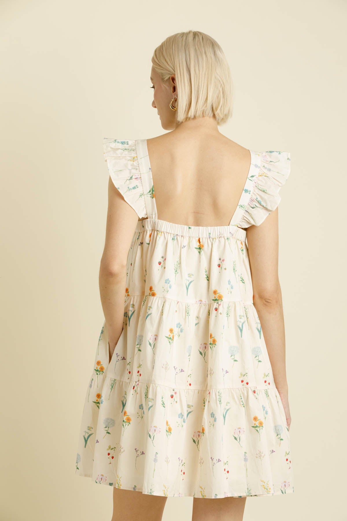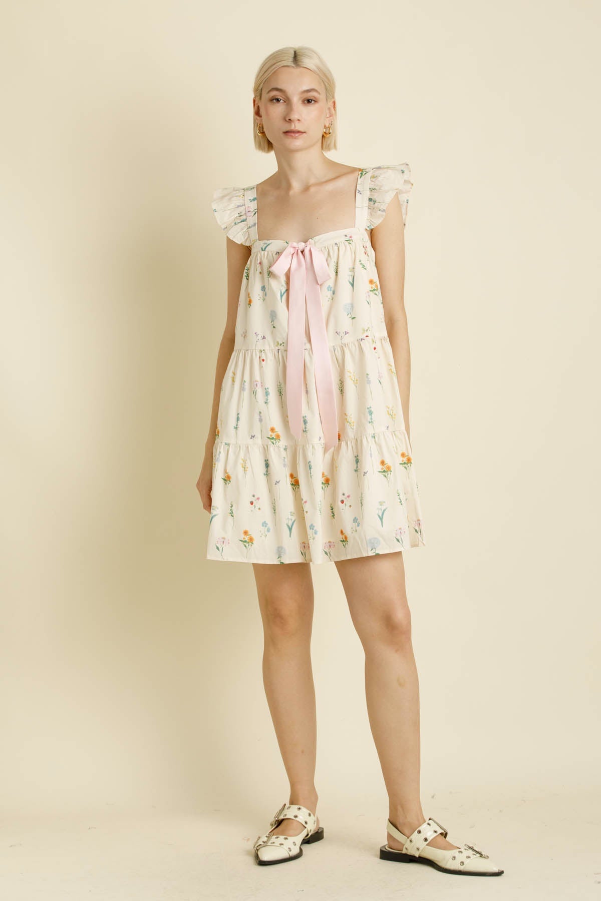 Get ready to flutter into spring with this oh-so-sweet mini dress! Crafted from cream cotton poplin and adorned with a wild flower print, its square neckline is perfectly accented by a delicate pink ribbon. The tiered skirt adds a touch of fun to this dress.
