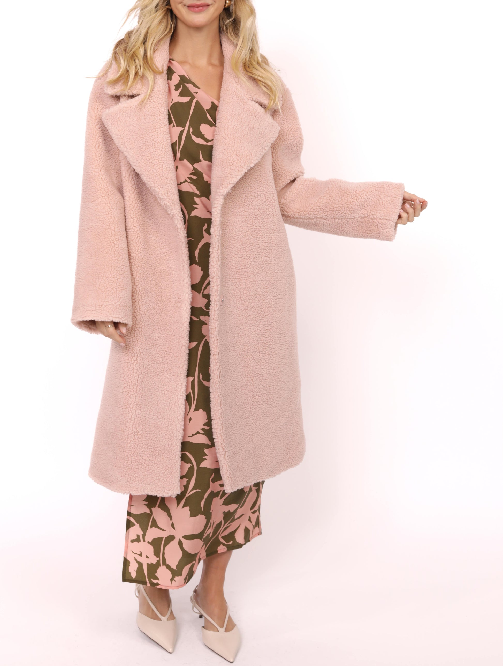 The Gemma Teddy Coat offers cozy warmth with its soft fabric and mid-calf length, making it perfect for cooler days. Its gentle blush color adds a subtle, elegant touch to any outfit while keeping you comfortably covered. Designed to blend comfort with style, this long coat is an ideal choice for staying snug without sacrificing a polished look.