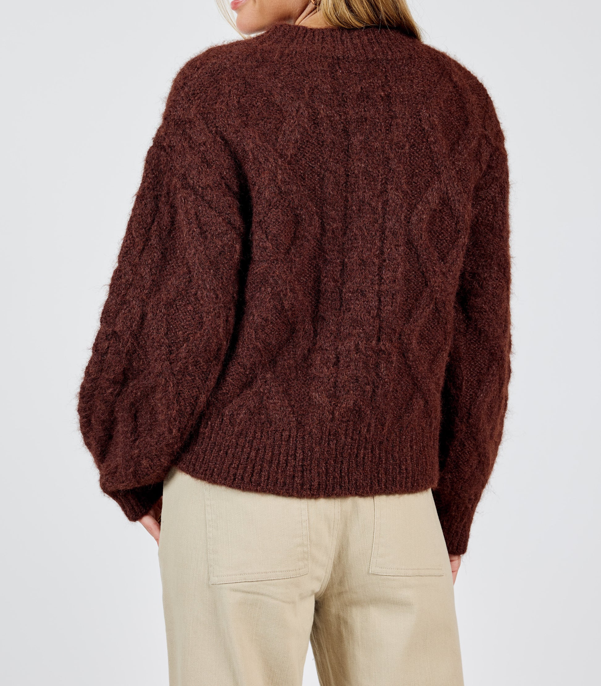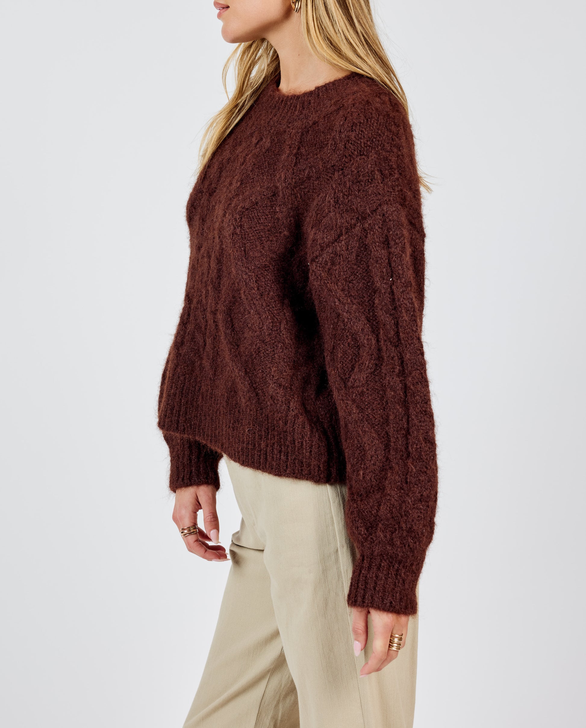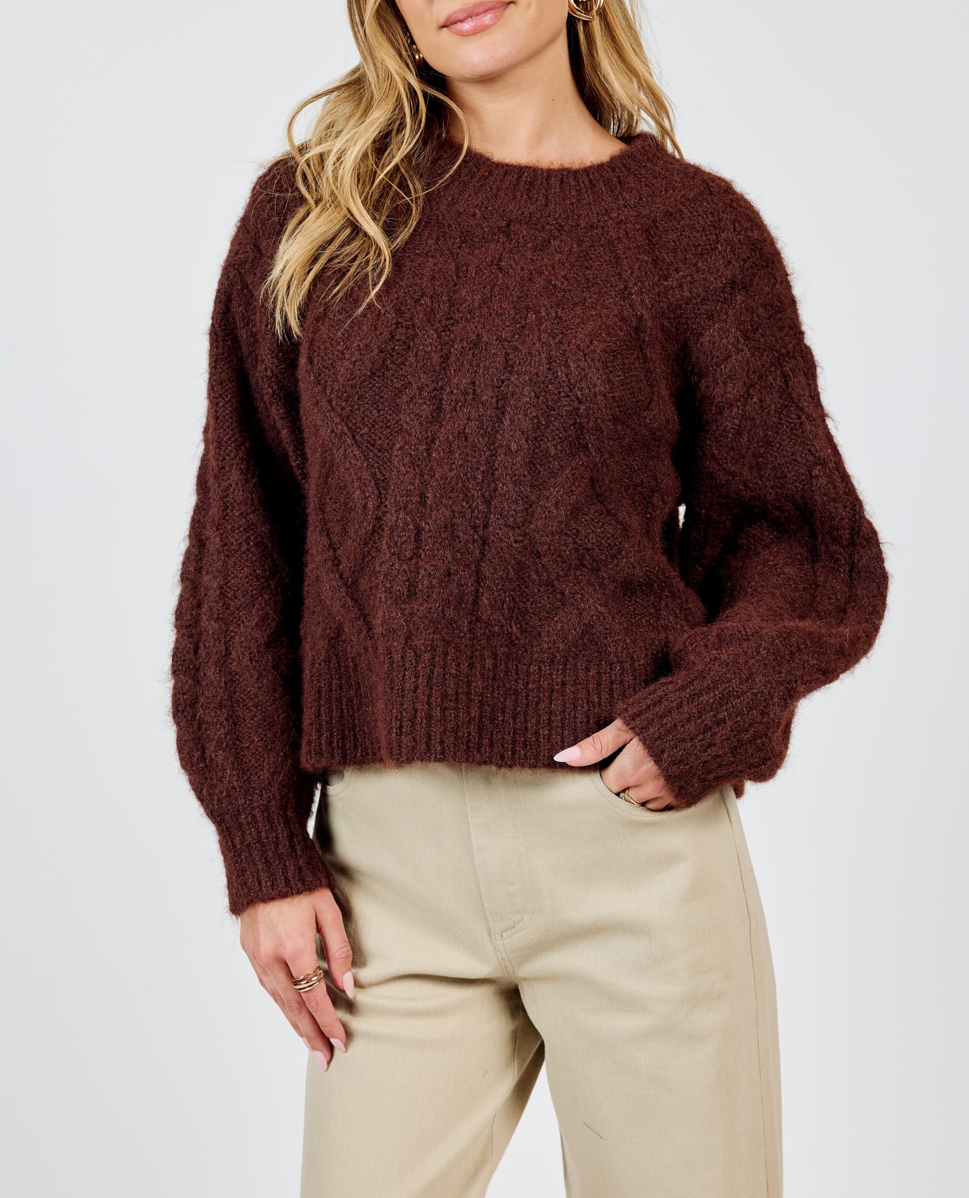 Experience ultimate comfort with our Join Hands Cable Knit Sweater. Made from a super soft and fuzzy material, this brown sweater is the ideal choice for keeping warm and cozy on chilly days. With its classic cable knit design, it's a stylish addition to any wardrobe.