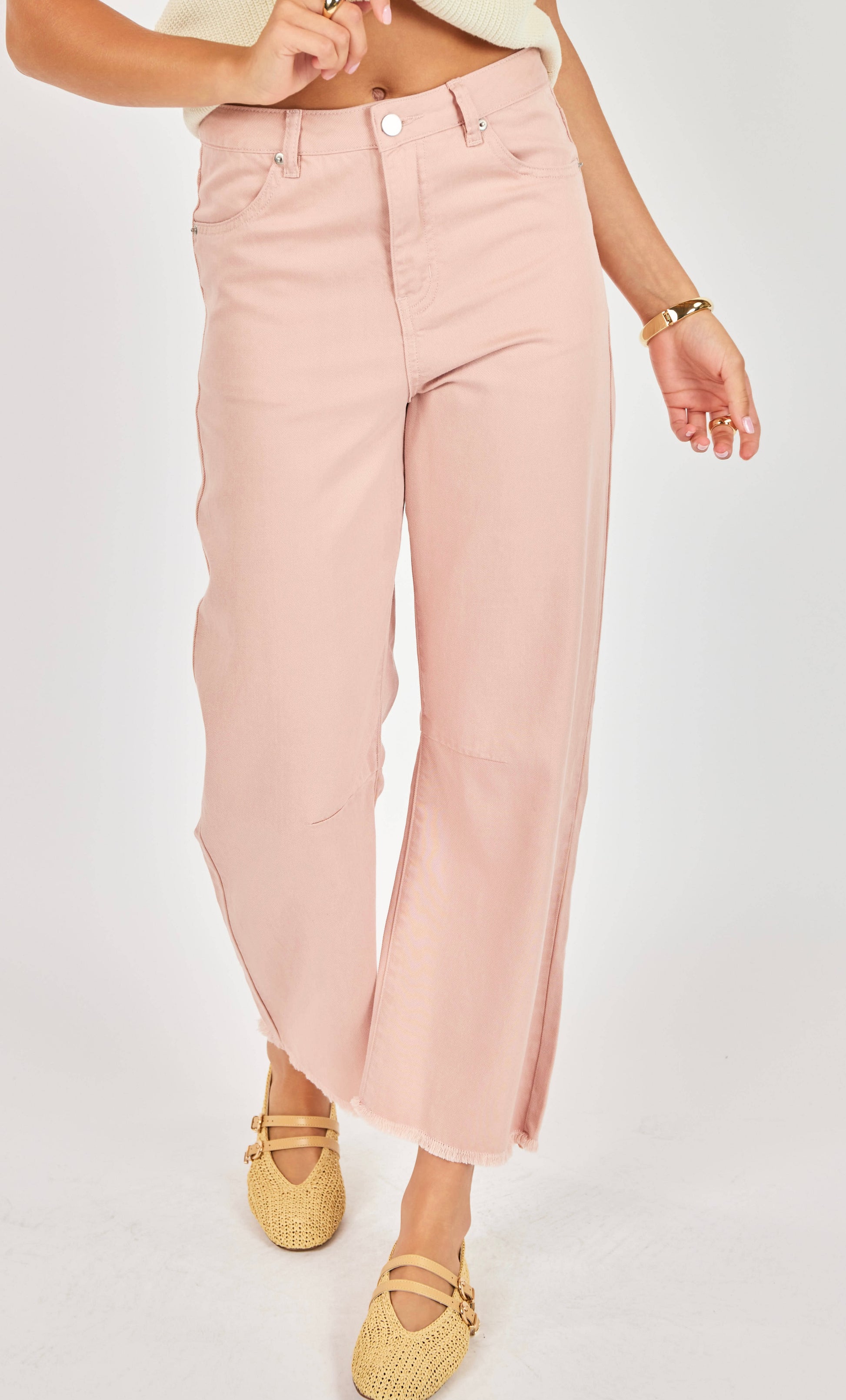 Judie Denim Barrel Pants offer a relaxed, modern silhouette with a cropped length that works beautifully with sneakers or heels. The soft washed pink fabric brings an effortless, approachable vibe to your everyday rotation, while the barrel leg provides comfortable room through the hip and thigh. Functional back pockets keep your essentials close. A versatile piece that feels as good as it looks.