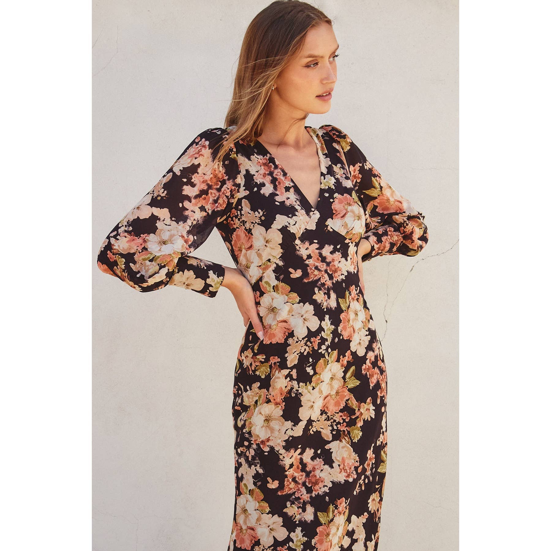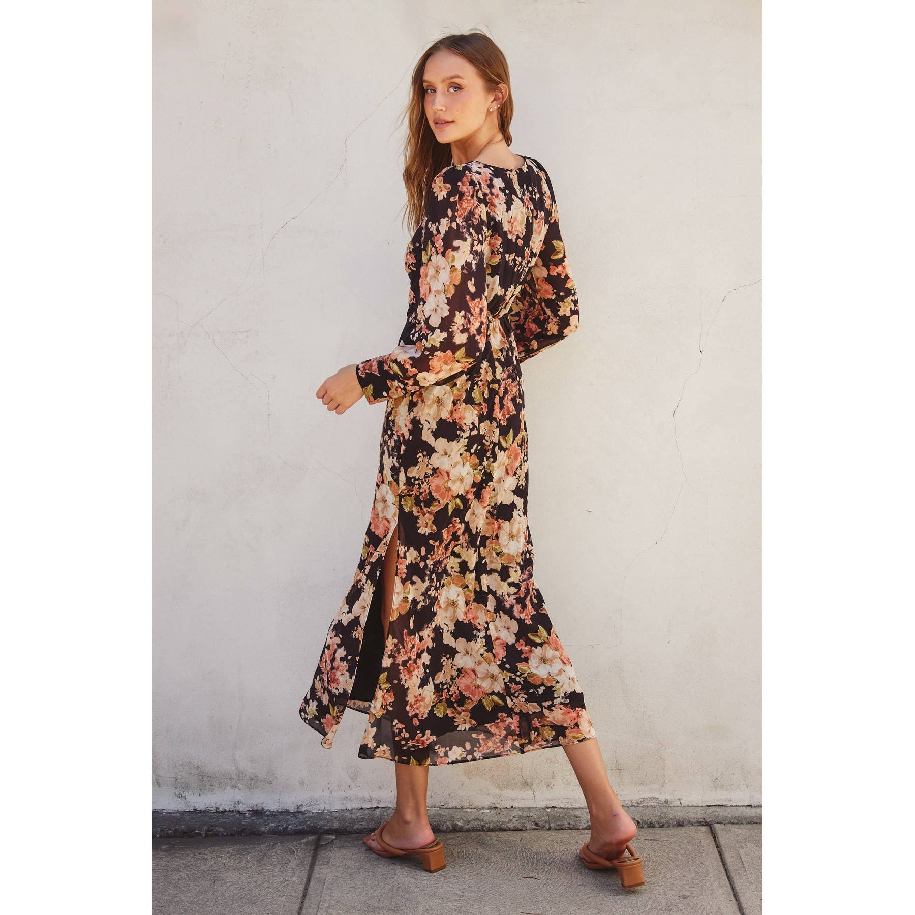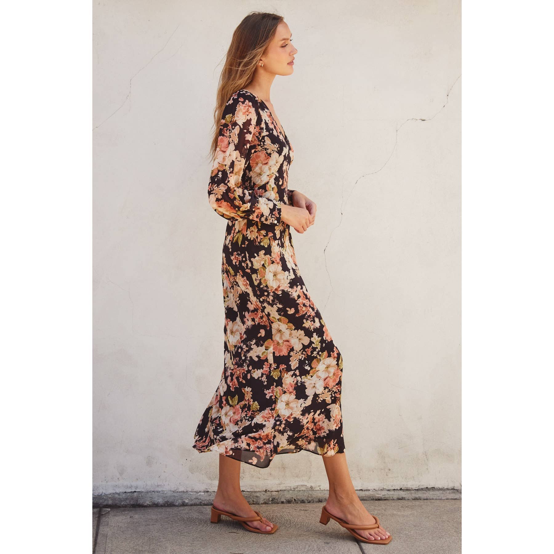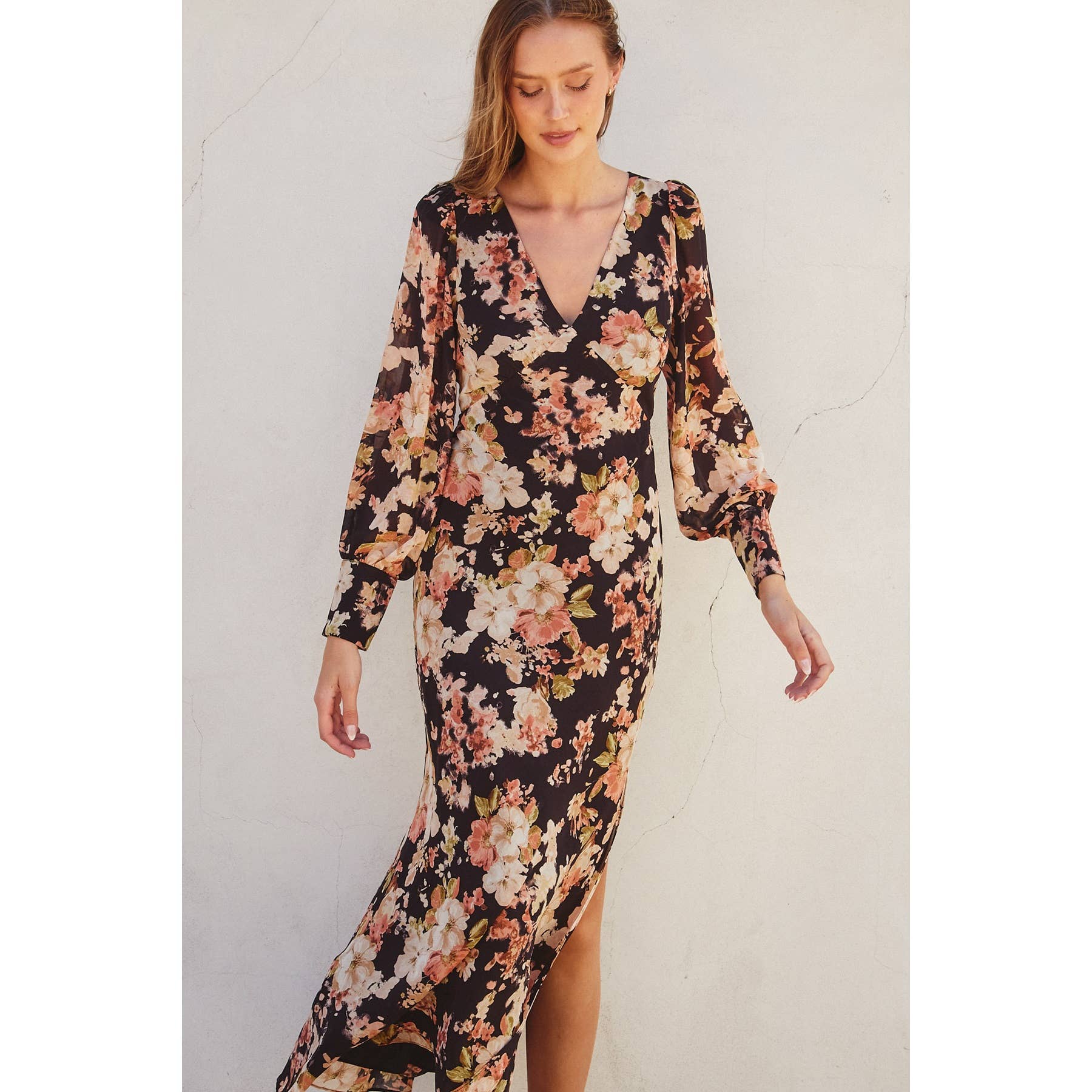 Floral print maxi dress with long sleeves and bishop sleeves. Model is 5'10" and wearing size Small. - Plunging neckline - Chevron seam - Bishop sleeves with buttoned cuffs - Elasticized backwaist - Left slit - Hidden center back zipper closure - Lined Shell: 100% Polyester Lining: 100% Polyester