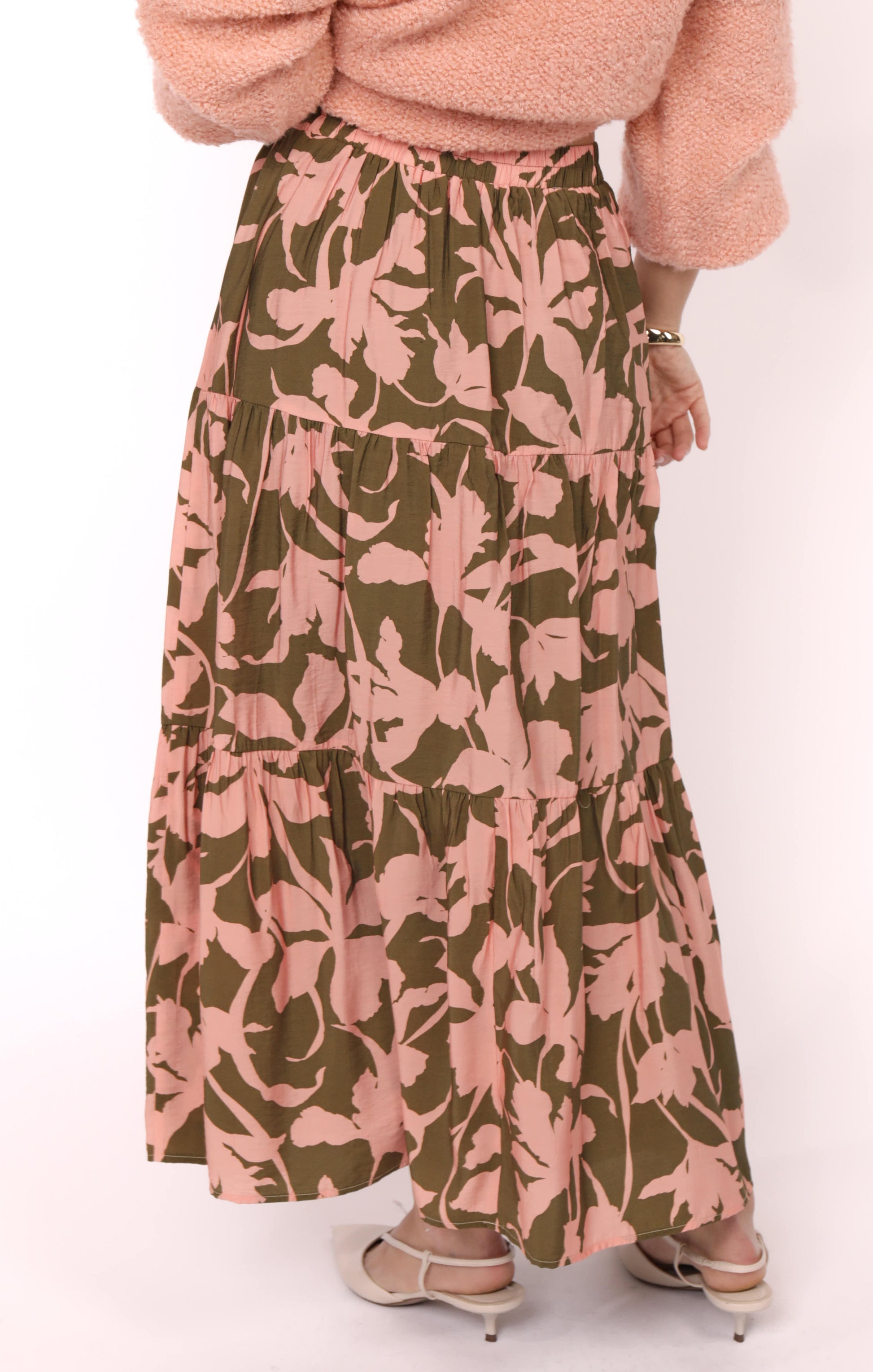 Embrace elegance with the My Dearest Maxi Skirt, featuring a graceful olive base adorned with a pink floral pattern. Its tiered design adds gentle movement and dimension, creating a flattering silhouette for any occasion. Perfect for those seeking comfort without compromising on style, this skirt pairs beautifully with your favorite tops to effortlessly elevate your wardrobe.