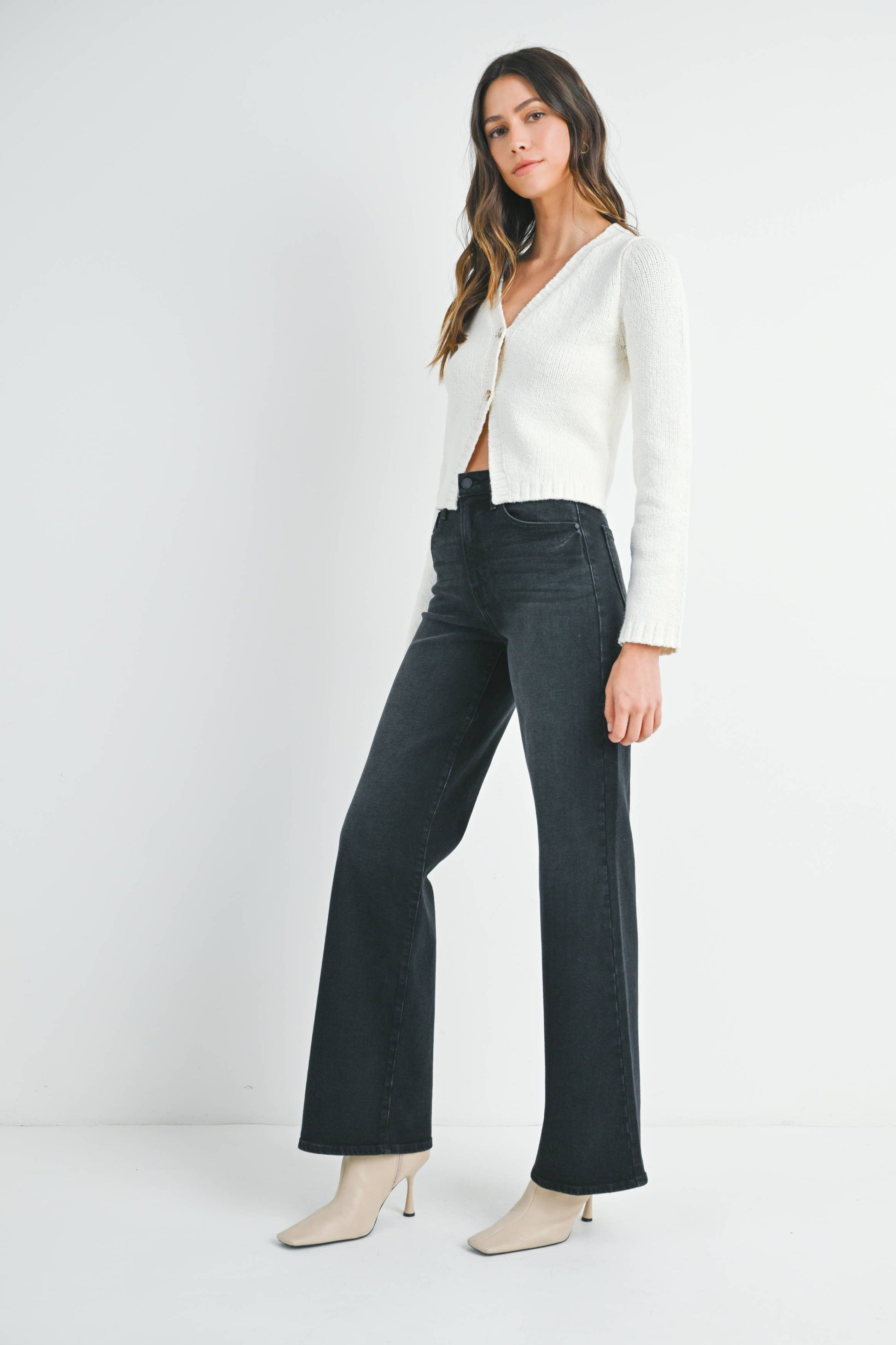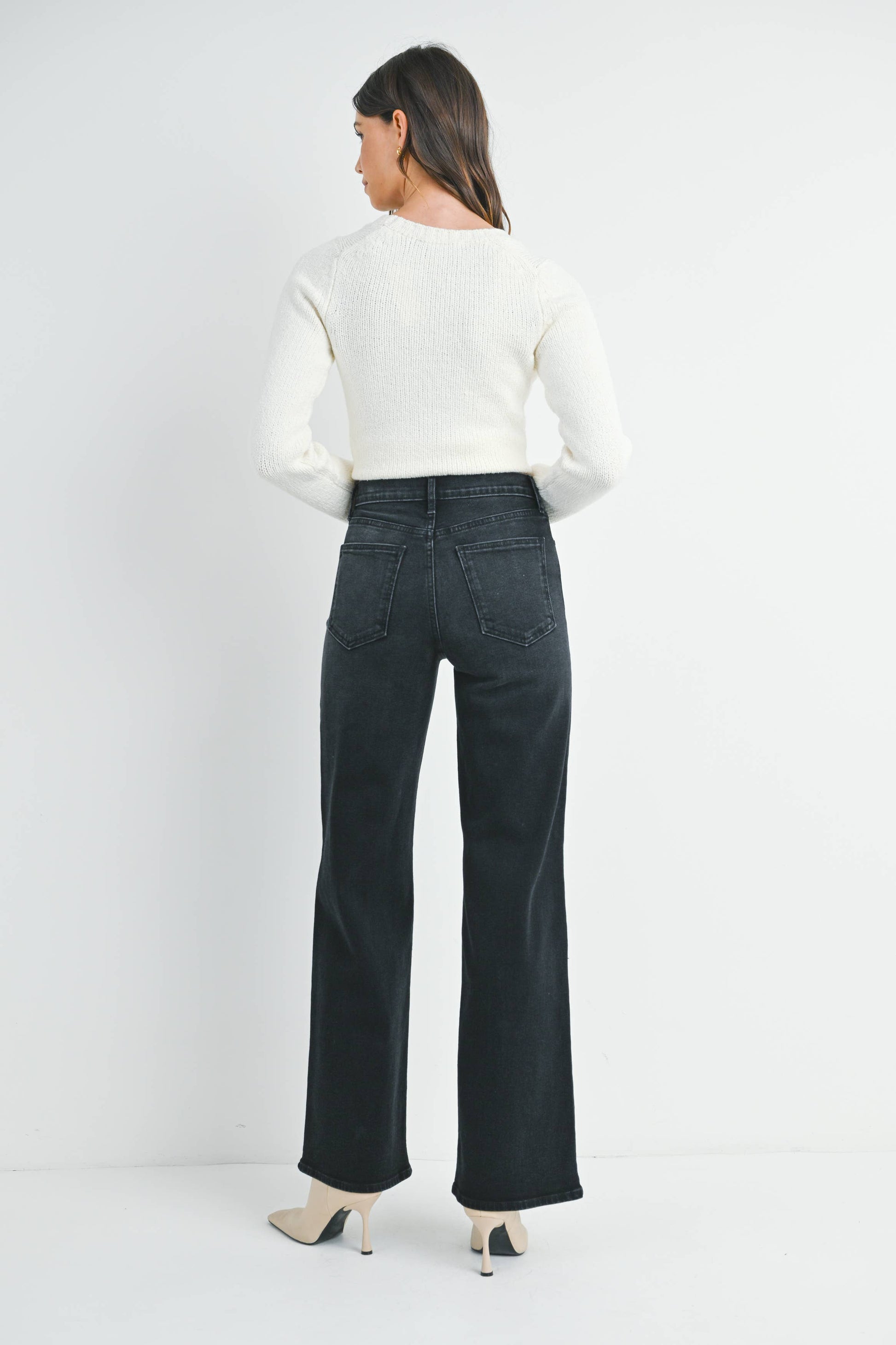 Crafted from premium denim with a washed black finish, this palazzo jean delivers a contemporary silhouette that balances proportion and comfort. The 11" rise sits at the natural waist, while the slim wide leg creates an elegant line from hip to hem. At 32" inseam, it's designed for a clean break at the ankle. This versatile piece transitions effortlessly from casual to refined styling, offering the structured fit that defines modern denim craftsmanship.