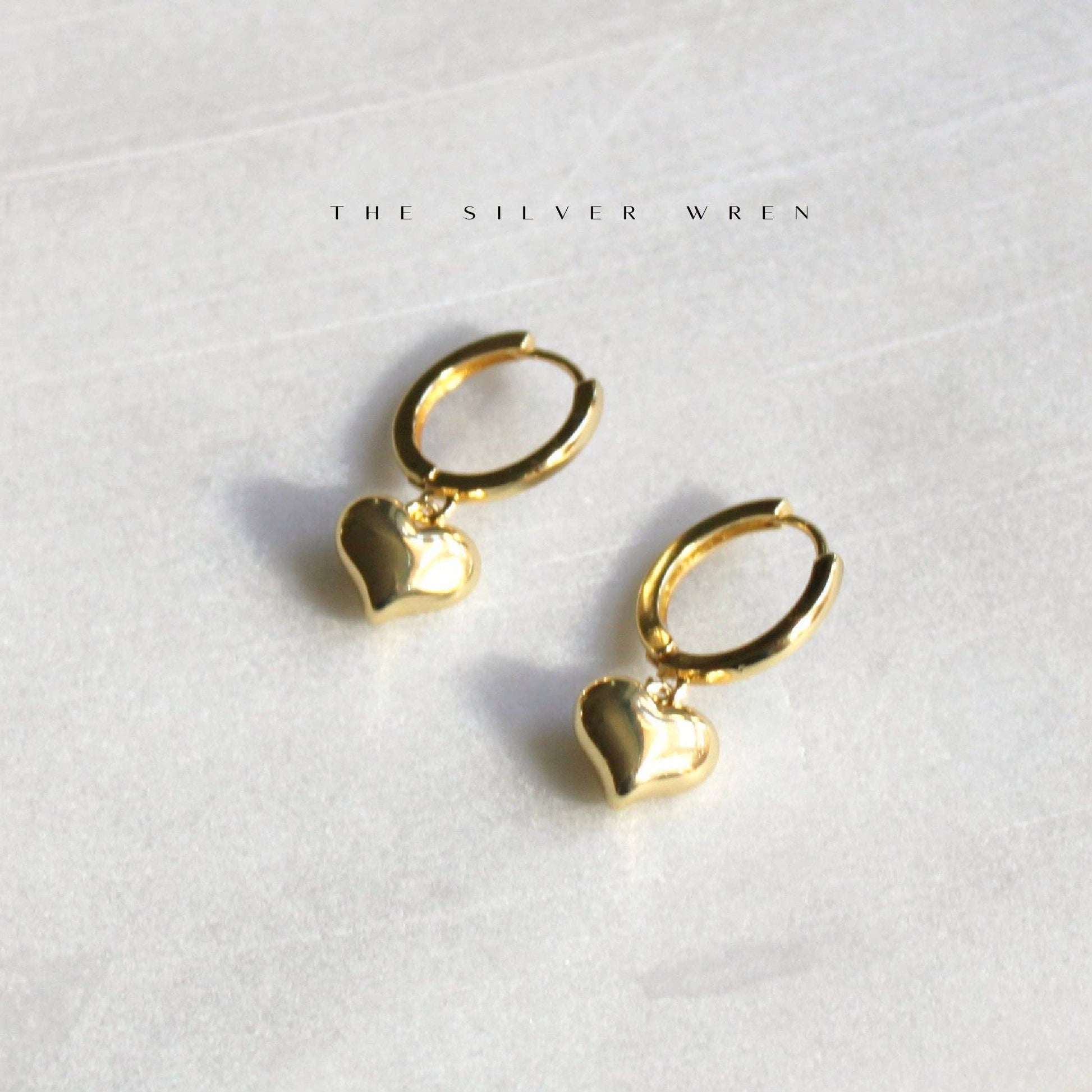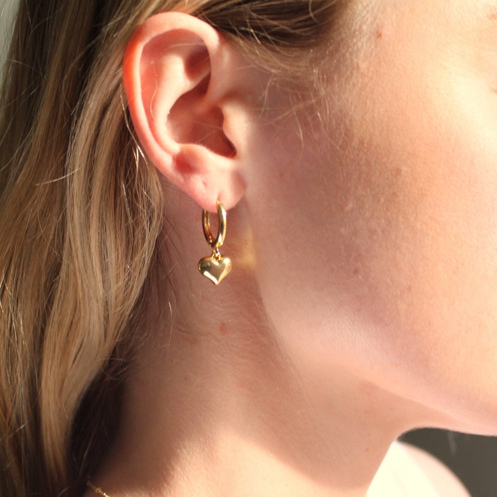 These earrings are high quality 18kt gold filled huggie hoops, 15mm. Adorned with gold filled puffy heart drops.