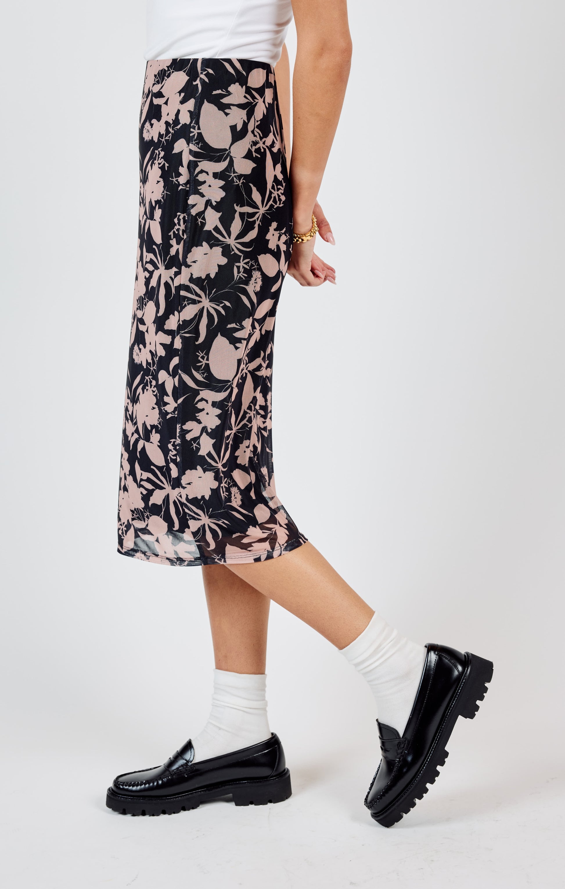 Revive your wardrobe with our Rejuvenate Midi Skirt, featuring a playful black and pink floral design. Made with easy-to-wear mesh fabric, this pull-on skirt adds a touch of whimsy to any outfit.