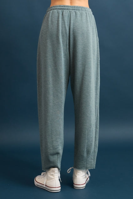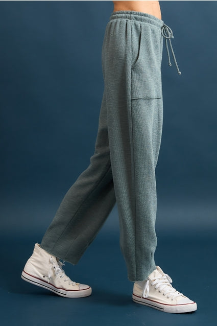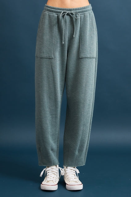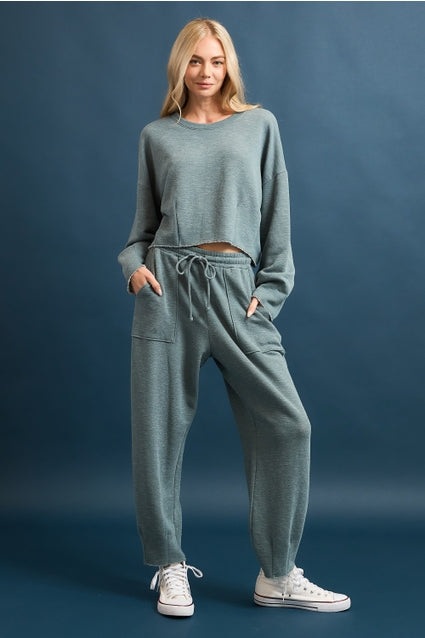 These Terry Slub Sweatpants in seagrass color combine functional design with contemporary style. Featuring a rough hem and ankle darts, they ensure a tailored, comfortable fit. Large front pockets add practicality, while the breathable fabric supports all-day wear. Perfectly paired with the Terry Slub Sweatshirt, this set offers a coordinated and sophisticated casual look.