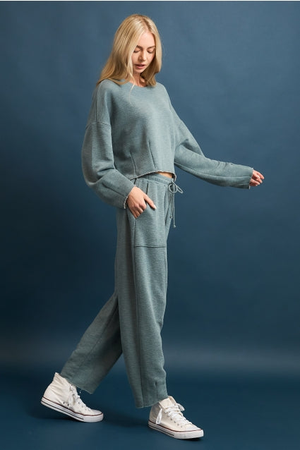This cropped Terry Slub Sweatshirt in seafoam green features tailored darts for a refined silhouette and a deliberately rough hem for an understated edge. Designed to complement the Terry Slub Sweatpants, it offers a cohesive yet sophisticated casual look perfect for relaxed wear with a touch of thoughtful detail.