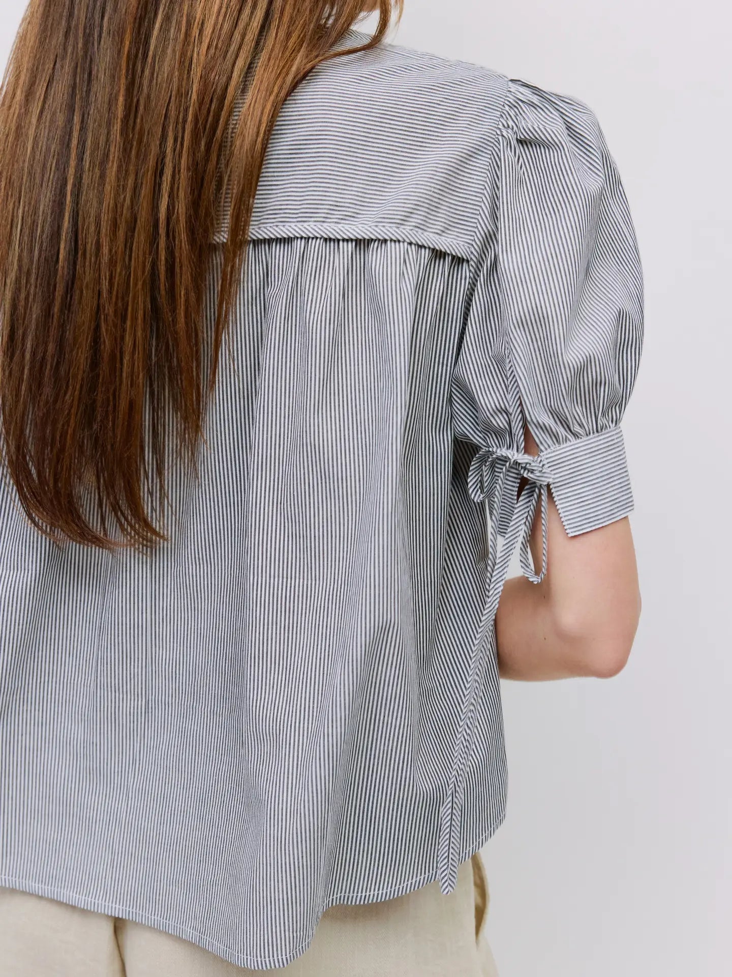 Effortlessly chic and playful, The Ross Top is the perfect addition to your wardrobe. With a lightweight peasant style and short puff sleeves adorned with charming tie details, this blouse is both comfortable and stylish. The subtle black and white stripes add a touch of sophistication, while the covered buttons add a classic touch.
