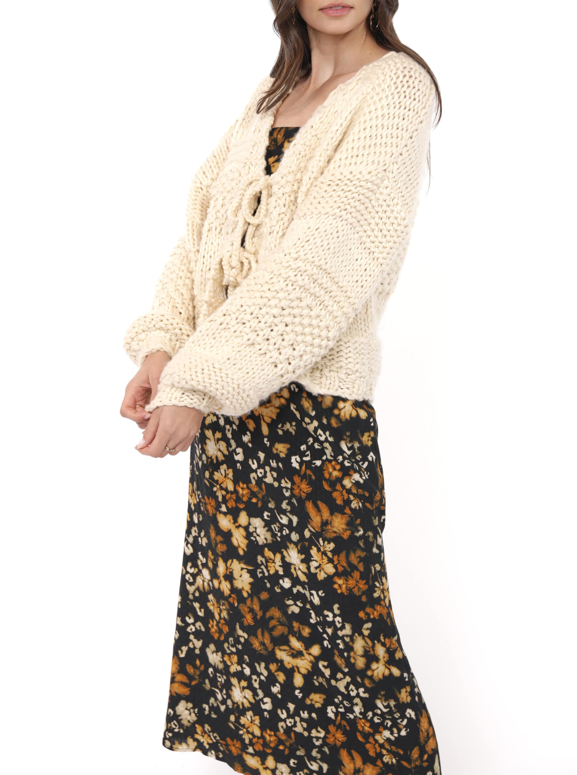 Wrap yourself in cozy charm with this hand-knit, super soft oversized cardigan. Its ivory hue and relaxed fit bring those irresistible grandma vibes, while the playful tie front adds a fun, flirty twist. Perfect for layering on chilly days or lounging in style, this cardi is your new go-to for effortless comfort and timeless warmth.