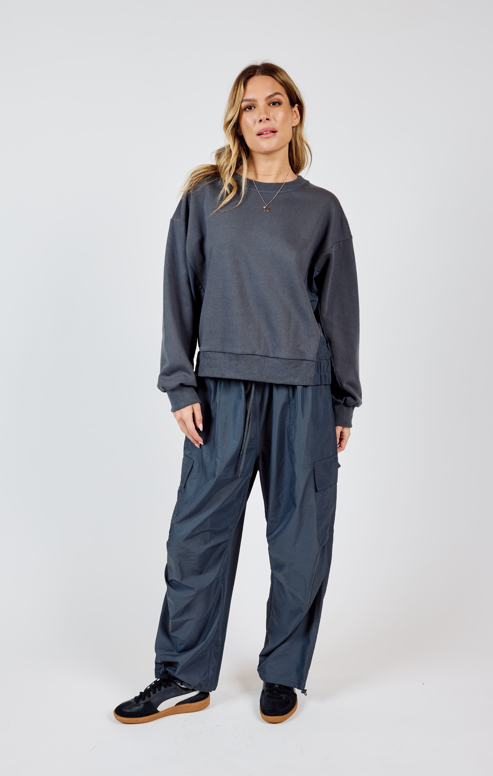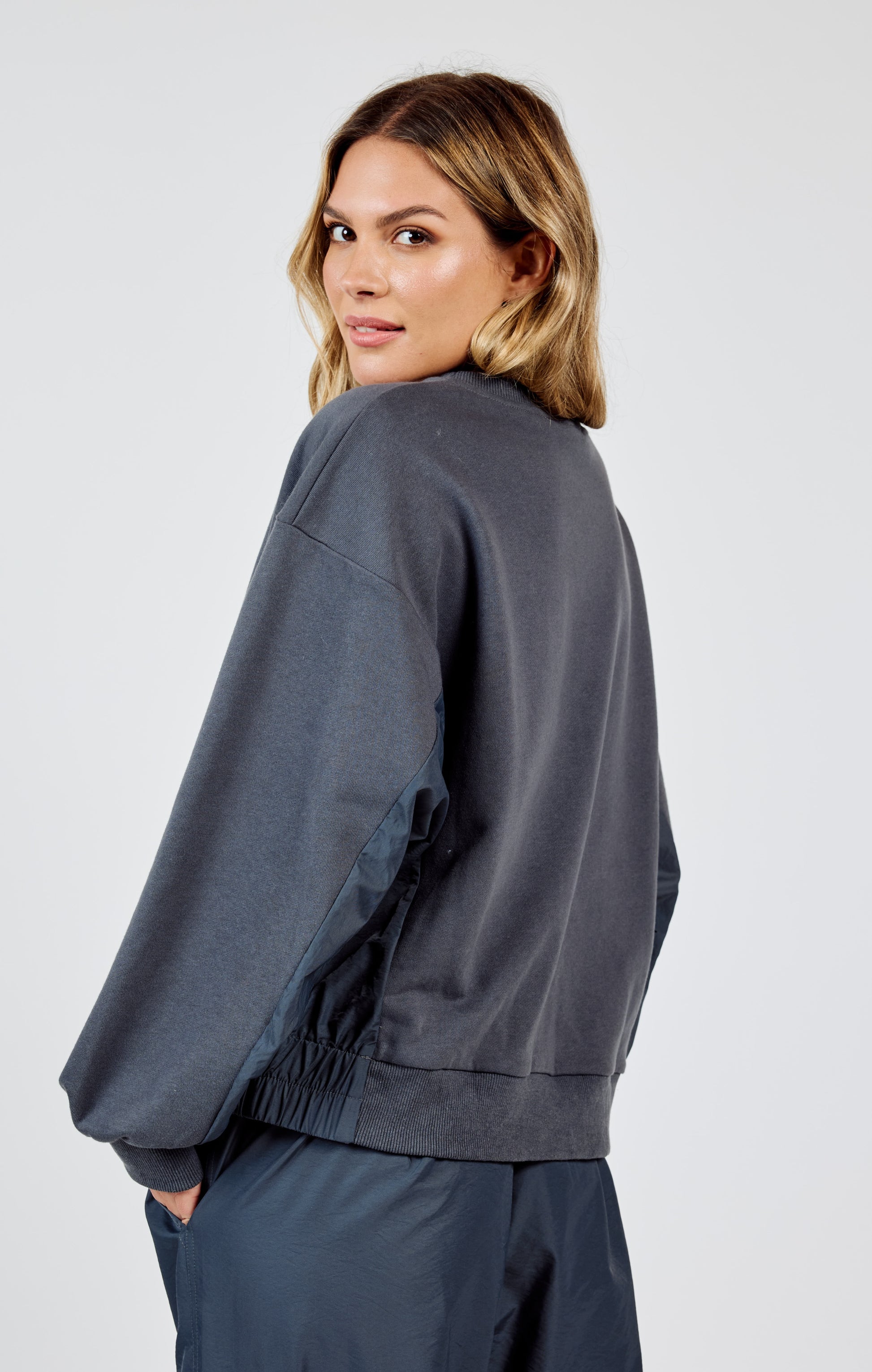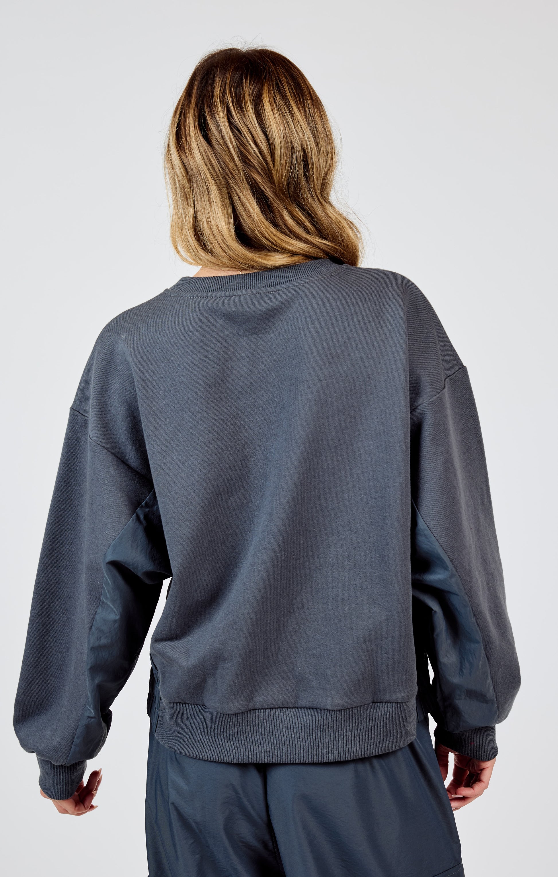 Introducing the Vita Crewneck: the perfect sweatshirt for those who appreciate style and comfort. In a sleek charcoal color, this crewneck features unique nylon panels under the arms for added breathability. Stay cool and look cool with this must-have addition to your wardrobe.